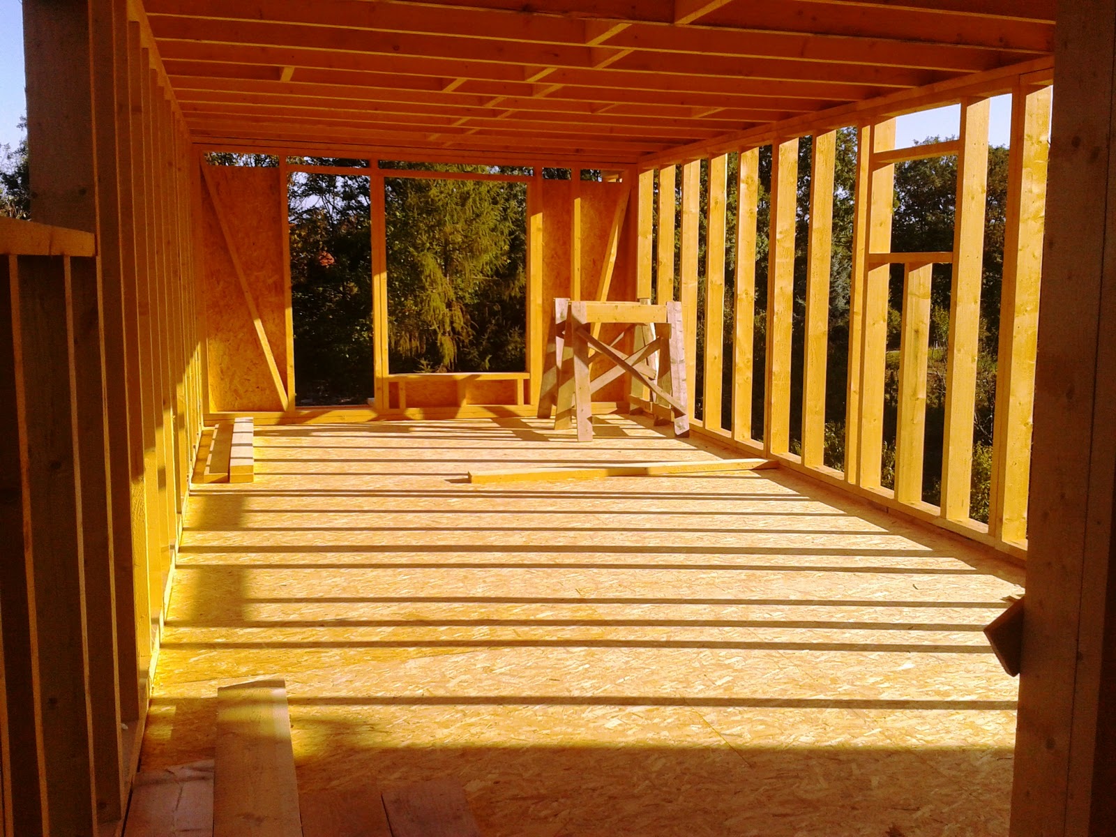Keď bolo zlé počasie urobili sme postupne záklop podlahy na oboch podlažiach a potom pokračovali v obíjaní dlhých stien domu naraz cez obe podlažia aj atiku... Píšem o obíjaní ale OSB dosky sme šróbovali skrutkami 4x60 s torxovou hlavou...